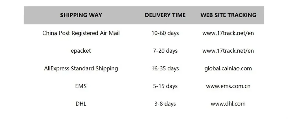 Other countries: 10 – 45 days by Aliexpress standard shipping.