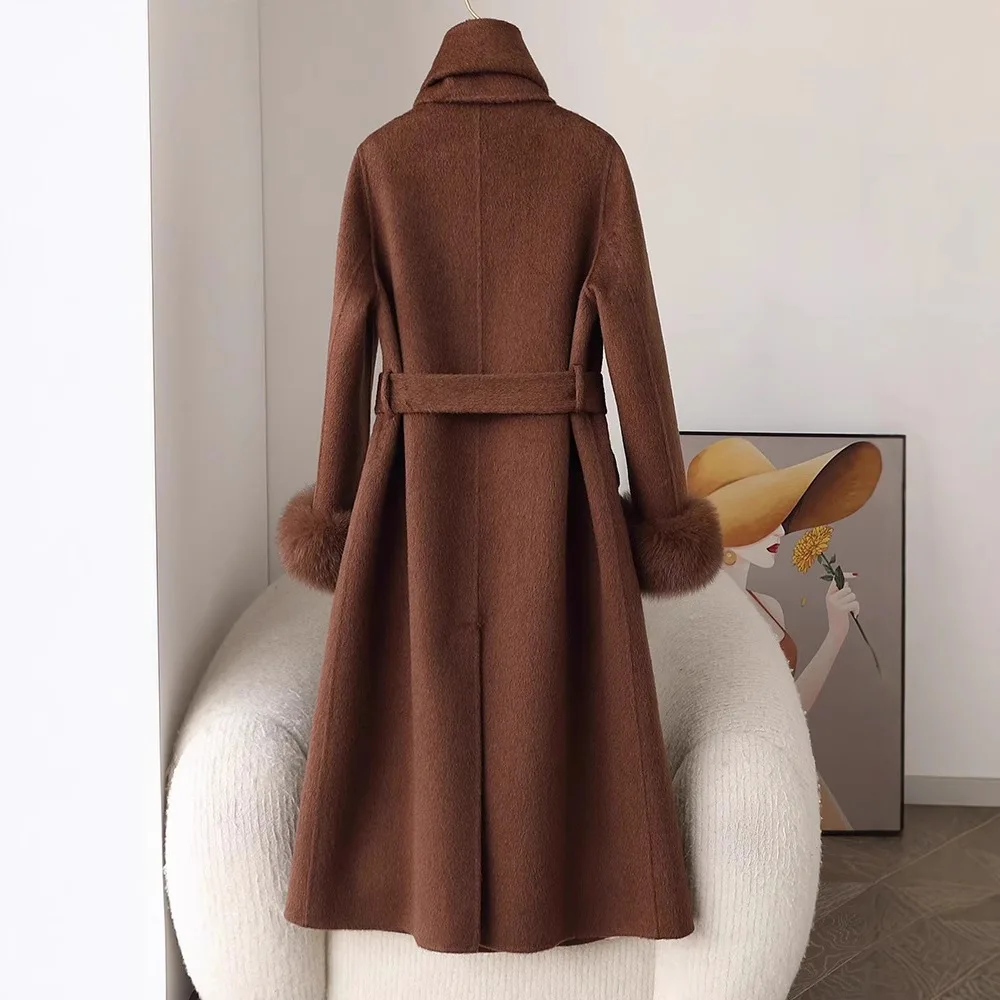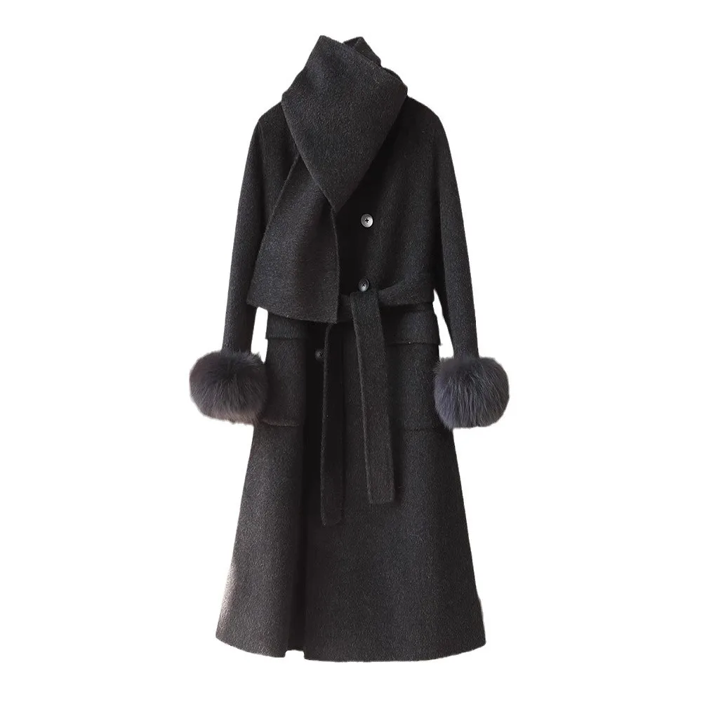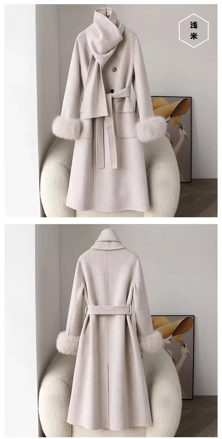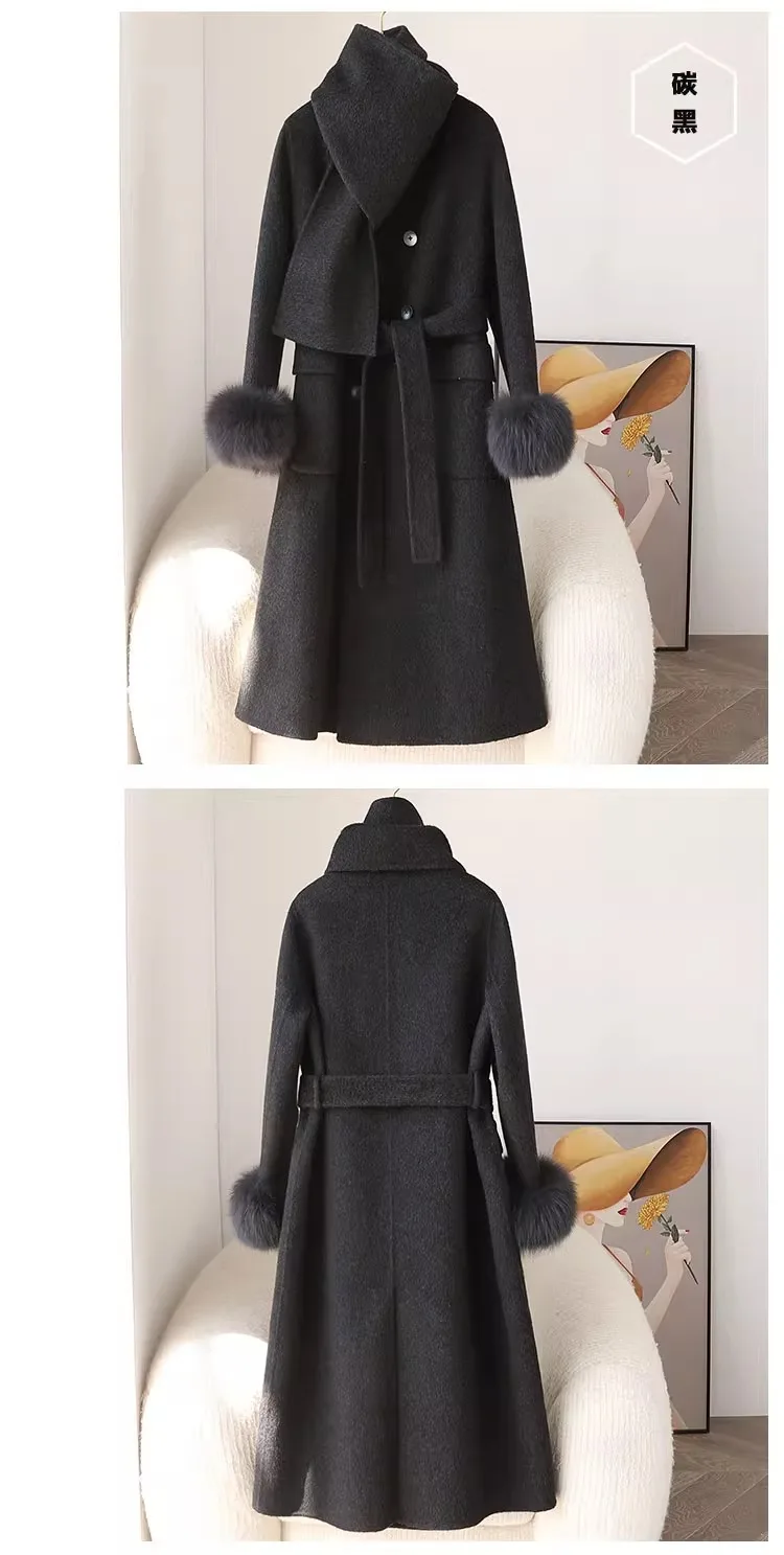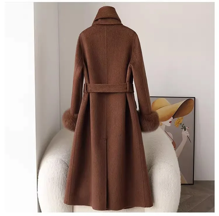 Fashion Knitted Cashmere Fur Collar Wool Coat Winter Coats for Ladies Women Long Wool Coat quantity