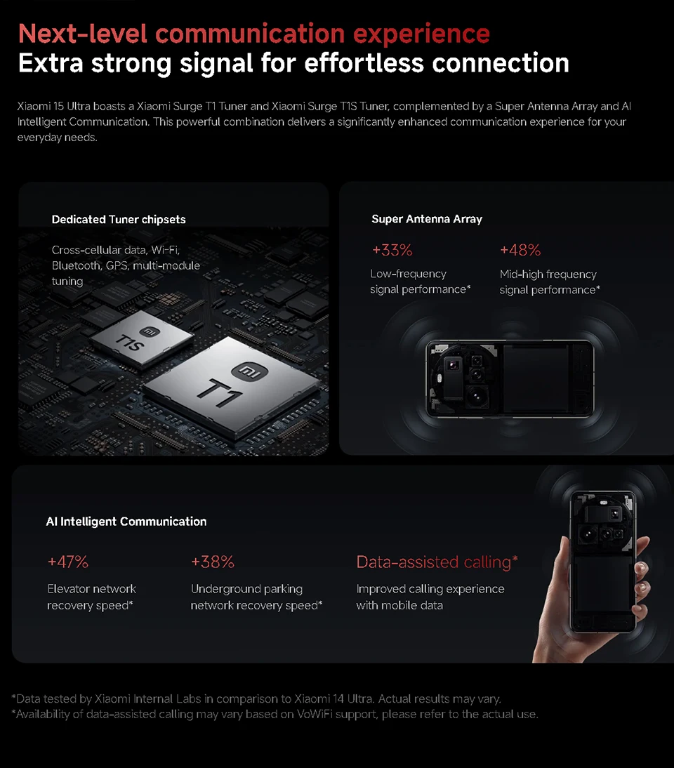 *Wi-Fi connectivity (including Wi-Fi frequency bands, Wi-Fi standards and other features as ratified in IEEE Standard 802.11 specifications) may vary based on regional availability and local network support. The function may be added via OTA when and where applicable.Dual band SimultaneousSupports 2×2 MIMO, 8×8 Sounding for MU-MIMO, Wi-Fi Direct, MiracastBluetooth 6.0, Dual-BluetoothSupports SBC/AAC/AptX/AptX HD/AptX Adaptive/LDAC/LHDC 5.0/LC3