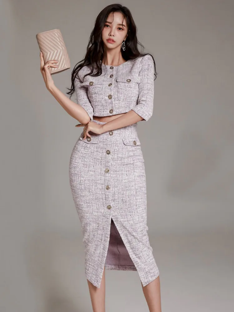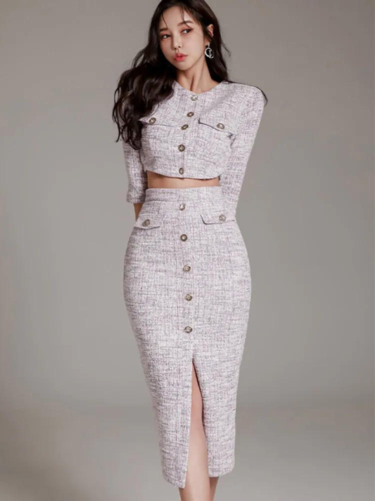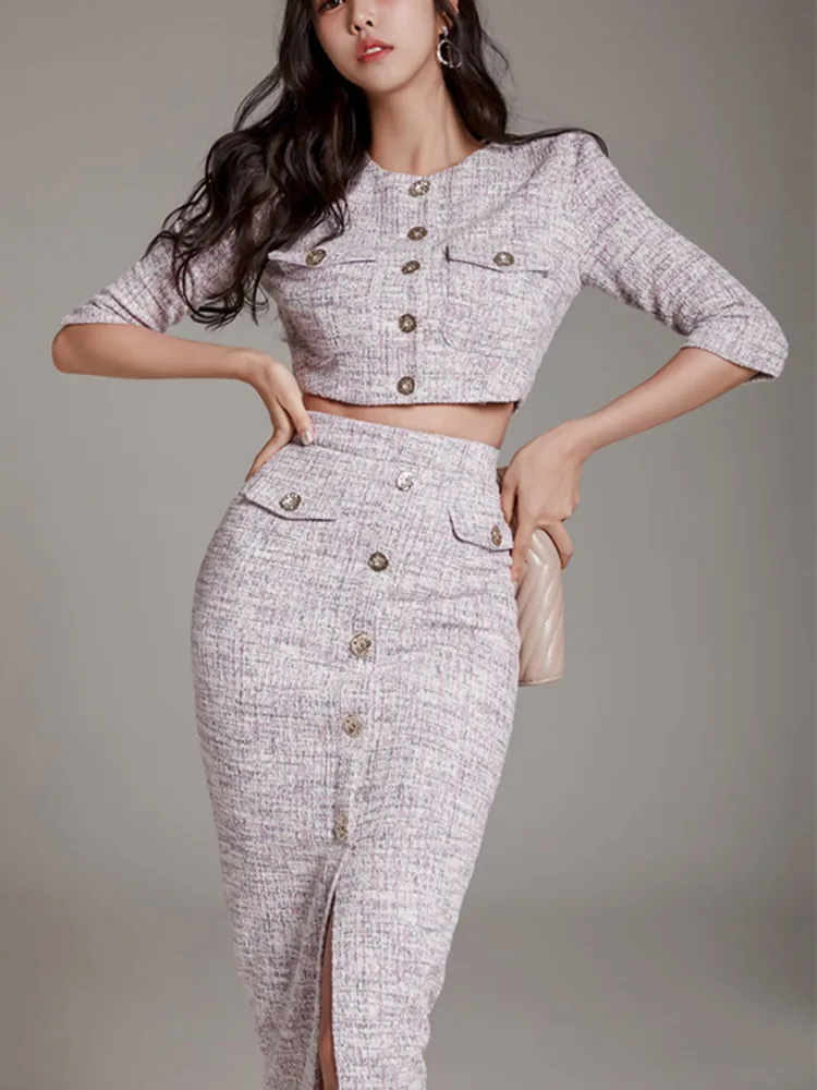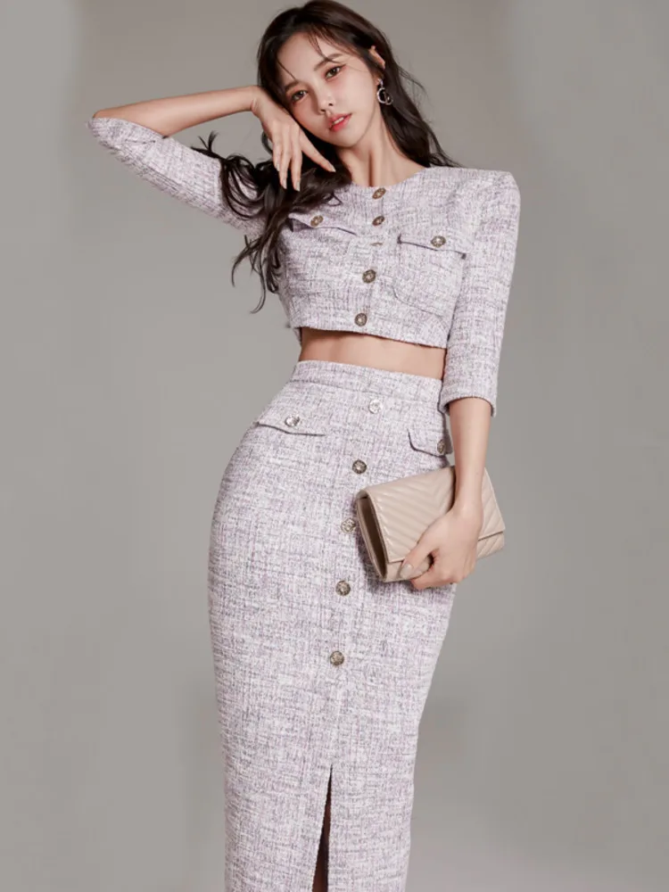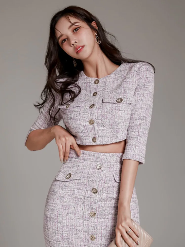 High Quality Tweed Two Piece Set Women Korean Fashion Half Sleeve Short Jacket Coat Crop Top + Skirt Sets Office Lady OutfitsHigh Quality Twe...