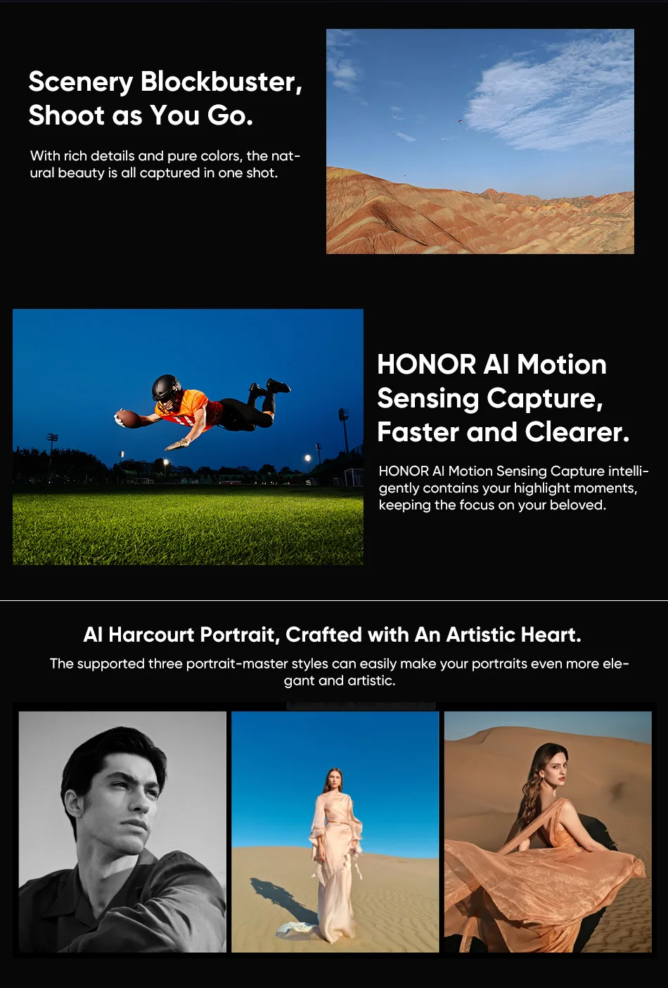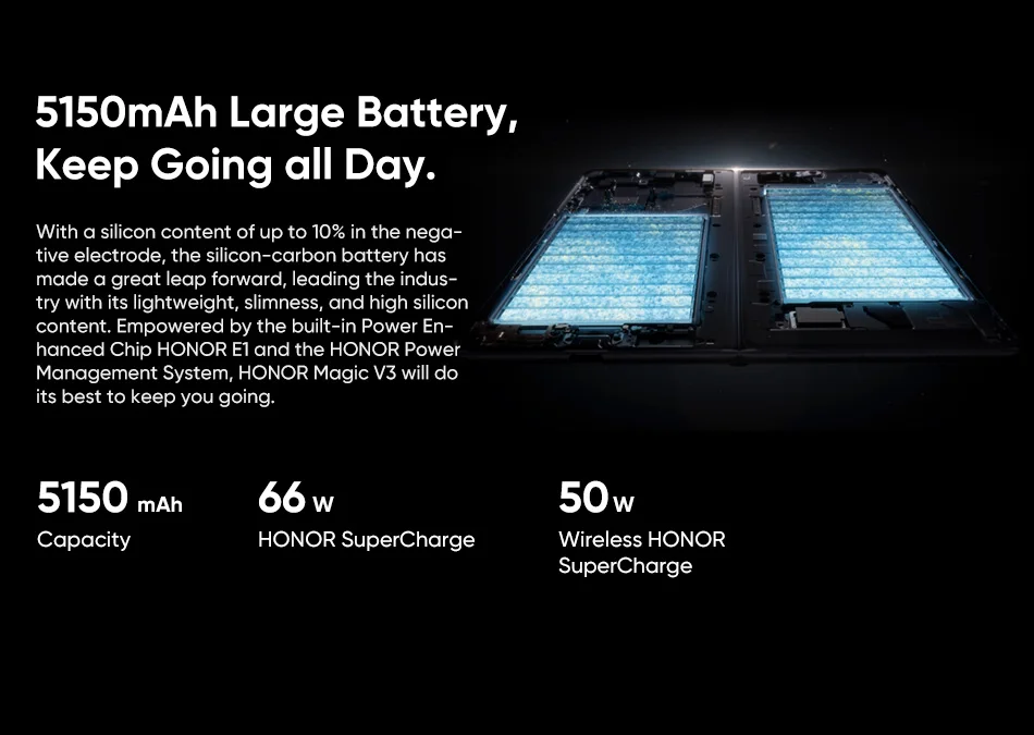 3. Battery and charging — 5150mAh,Type: Lithium polymer battery (HONOR Third-generation Silicon-carbon Battery); Wired charging: 66W, supports up to 11V/6A SuperCharge, compatible with 10V/4A and 5V/2A; Standard charger:HONOR 66W SuperCharge Charger;Wireless Charging: 50W Wireless HONOR SuperCharge.