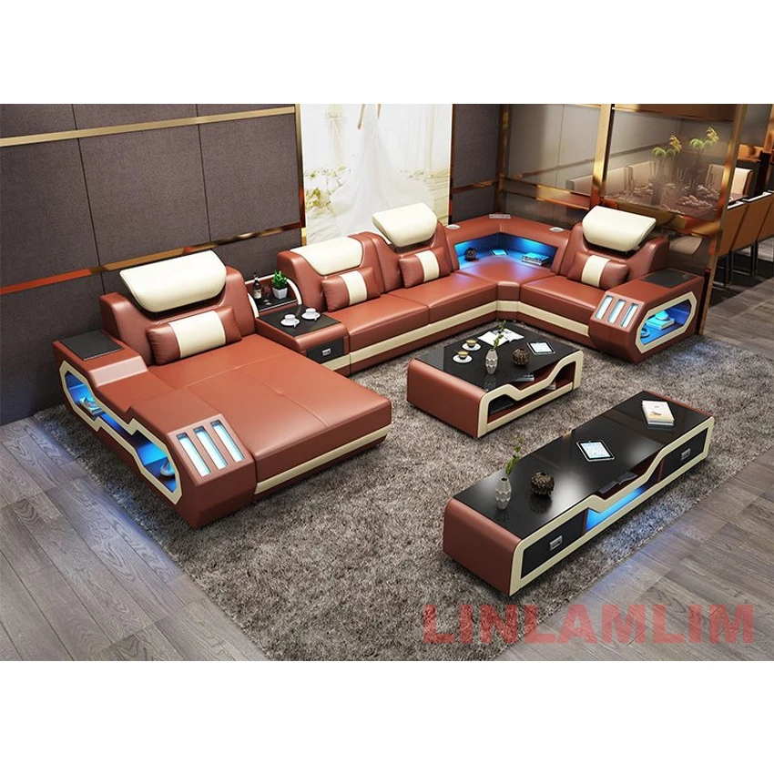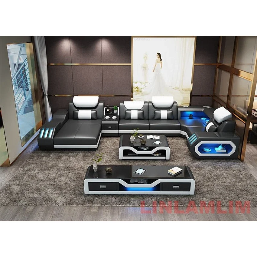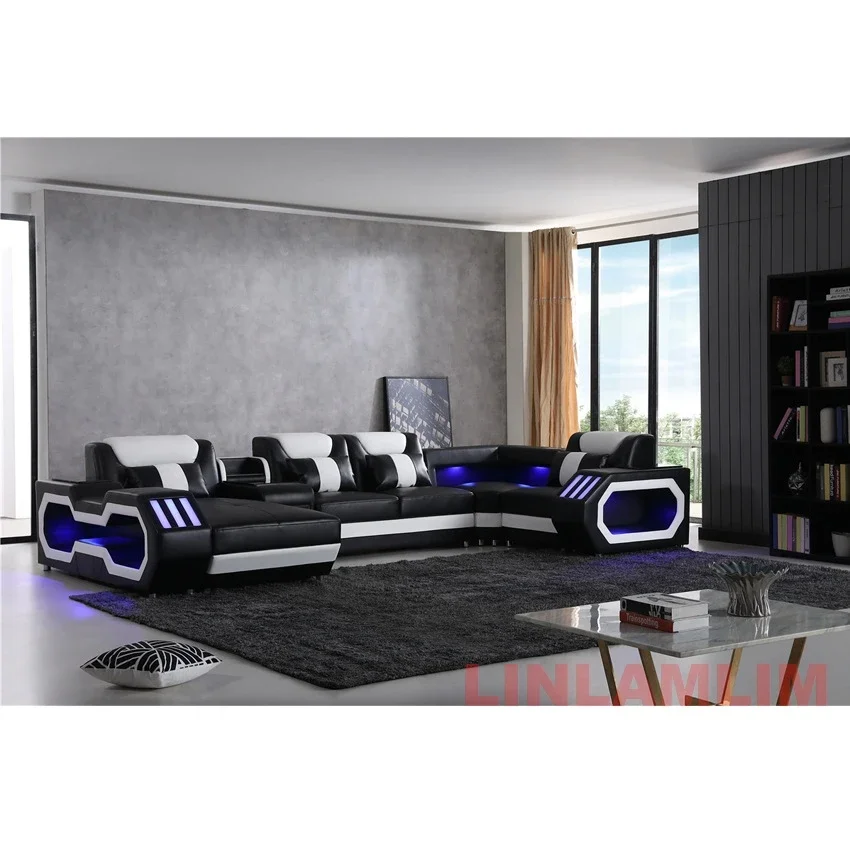 Modern LED Lighted Sofa Set with Recliner & USB Ports, Luxury Leather Sectional Couch for Living Room, Contemporary Home Furniture with Futuristic Design and Adjustable Headrests.